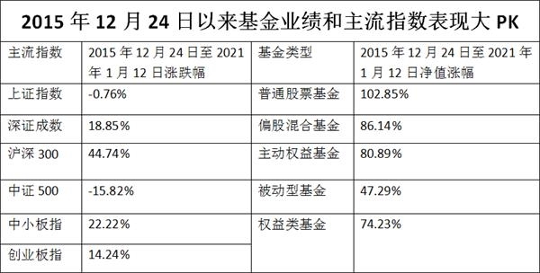 让市场回到5年多前,也就是2015年12月24日,当天上证指数收于3612.49点,和2021年的1月12日收盘点位3608.34点,沪指基本“零涨幅”,而期间公募主动权益基金获得超80%的收益率,更有超400只基金实现业绩翻倍。