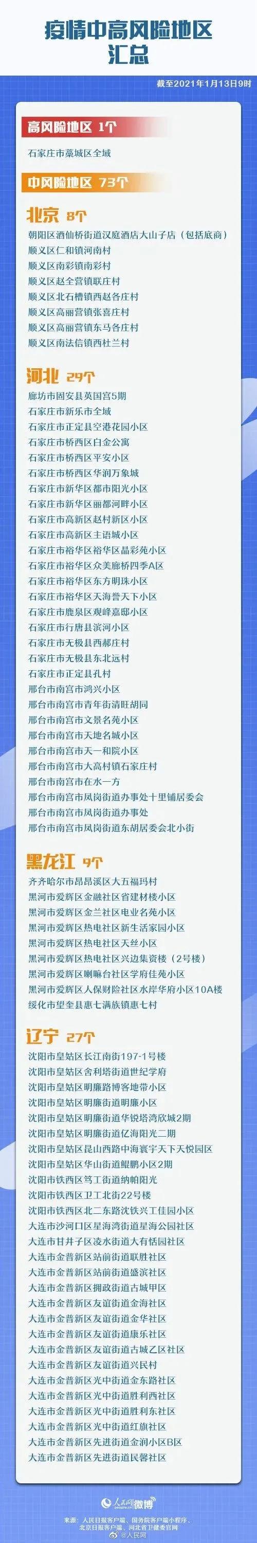 截至1月13日9时,全国共有1个高风险地区,73个中风险地区。