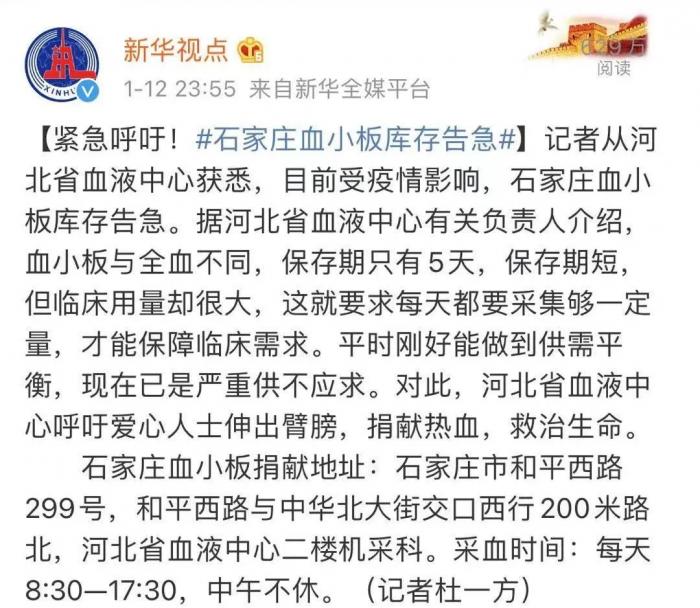 据@新华视点 消息,记者从河北省血液中心获悉,目前受疫情影响,石家庄血小板库存告急。据河北省血液中心有关负责人介绍,血小板与全血不同,保存期只有5天,保存期短,但临床用量却很大,这就要求每天都要采集够一定量,才能保障临床需求。平时刚好能做到供需平衡,现在已是严重供不应求。对此,河北省血液中心呼吁爱心人士伸出臂膀,捐献热血,救治生命。