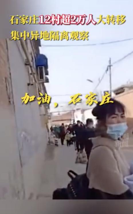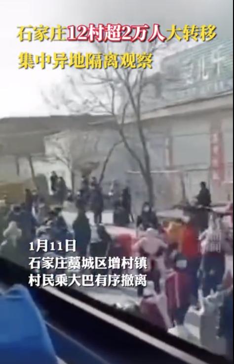 近日,一段“藁城区12村庄逾2万人异地隔离”视频在网上刷屏。据报道,1月11日,河北石家庄藁城区增村镇12个村庄逾2万人大转移异地集中隔离观察,村民们拎着行李,乘坐大巴有序撤离。