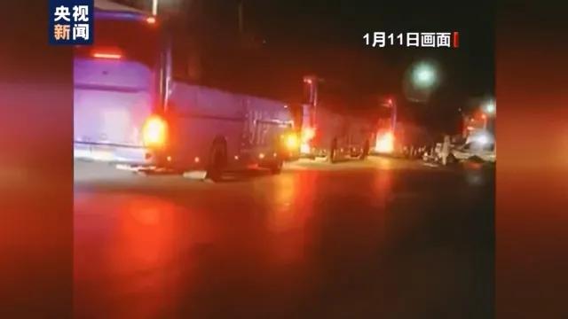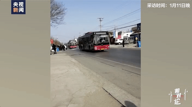 11日上午,藁城区增村镇增村居民小凡在路边等车时拍下的视频显示,多辆用来运送村民的公交车驶过。村民们携带行李,在路边等候,“共约一两百人”。