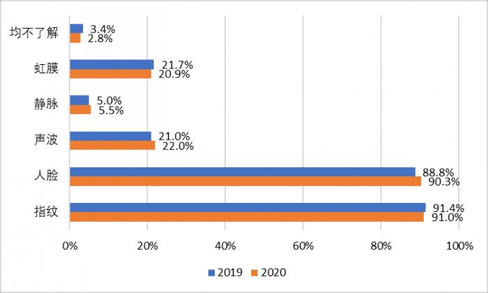 据了解,目前移动支付中生物识别技术主要有指纹、人脸、声波、虹膜、静脉等。报告显示,2020年,用户对移动支付的生物识别技术的了解,排名第一的是指纹,占比91.0%;排名第二的是人脸,占比90.3%;排名第三的是声波,占比22.0%;排名第四的是虹膜,占比20.9%;排名第五的是静脉,占比5.5%;排名第六的是均不了解占比2.8%。