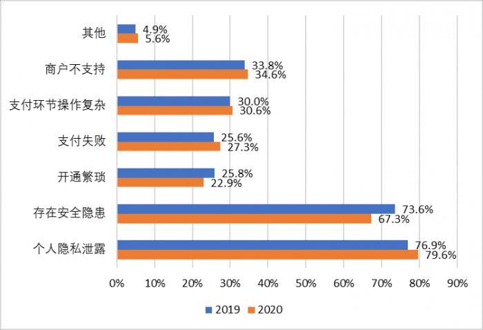 报告显示,2020年用户在使用生物识别技术来进行移动支付身份识别和交易验证时,比较担心的问题中,排名第一的是个人隐私泄露,占比79.6%,较去年提高2.7个百分点;排名第二的是存在安全隐患,占比67.3%,较去年下降了6.3个百分点;排名第三的是商户不支持,占比34.6%;支付环节操作复杂和支付失败占比分别为30.6%和27.3%,较去年略有提高;开通繁琐占比22.9%,同去年相比有所下降。