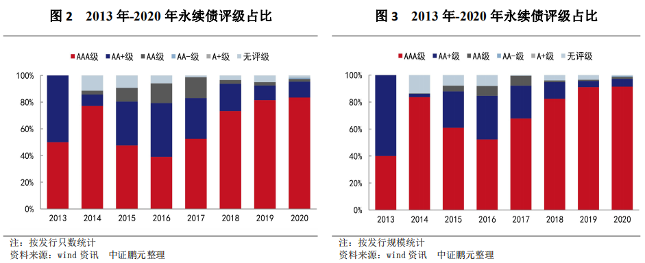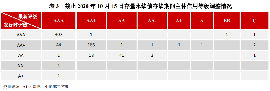 截至2020年10月15日,存量永续债中存续期间发生级别下调的有54只债券,其中,AAA级下调到AA+级及以下的债券共42只,由AAA级下调到AA+级的债券28只,下调到AA级的债券11只,下调到BB级的债券1只,下调到C级的债券2只;AA+级下调到AA级及以下的债券共9只,由AA+级下调到AA级的债券3只,下调到AA-级的债券1只,下调到A+级的债券1只,下调到A级的债券2只,下调到C级的债券2只;AA级下调到AA-级及以下的债券共3只,由AA级下调到AA-级的债券2只,下调到C级的债券1只。存量永续债中存续期间发生级别上调的债券138只,其中,AA+级上调到AAA级的债券98只;AA级上调到AAA级的债券4只,上调到AA+级的债券31只;AA-级上调到AA+级的债券1只,上调到AA级的债券3只;A+级上调到AA+级的债券1只。