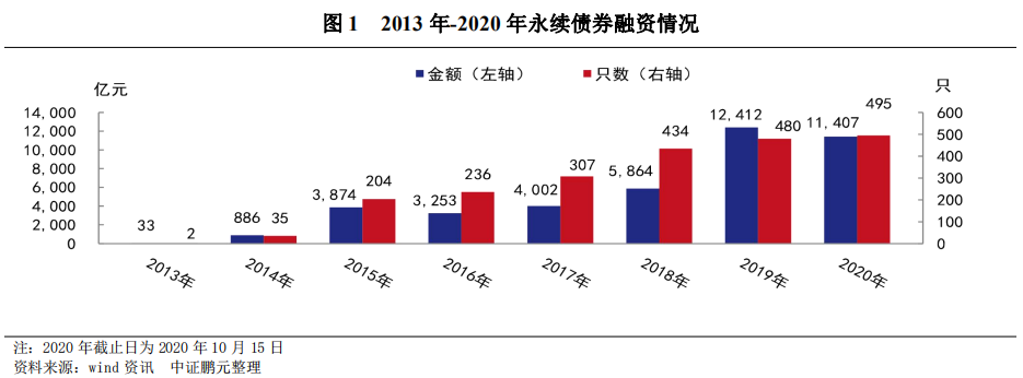 自2013年第一只永续债13武汉地铁可续期债发行以来,国内永续债市场不断扩容。2013年,国内永续债发行规模33亿元,占信用债发行规模之比为0.05%,发行只数2只,占信用债发行只数之比为0.06%。到2019年,永续债发行规模12,412.28亿元,较2013年底增长超375倍,占信用债发行规模之比上升为3.39%,发行只数480只,较2013年增长239倍,占信用债发行只数之比上升为1.13%,永续债券已成为近年来国内债券市场上增长较为迅速的债券品种之一。今年以来,截止2020年10月15日,永续债共发行11,406.67亿元,发行只数495只。