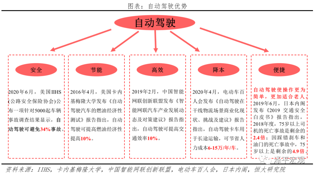 1)更加安全。2020年6月,美国IIHS(公路安全保险协会)发布基于5000起汽车安全事故调查报告显示,其中由于感知失误、能力丧失造成的碰撞事故分别约占24%、10%,这两部分事故对于自动驾驶车辆完全可以避免,也即自动驾驶可以减少34%的安全事故。