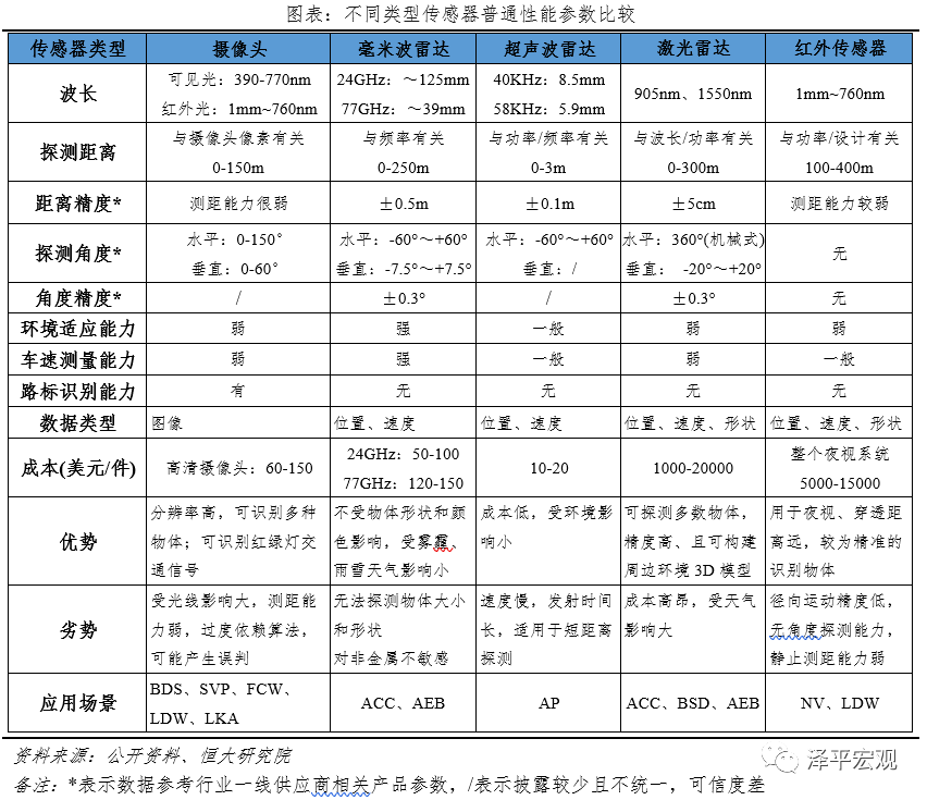 不同传感器由于工作原理不同,其优缺点各异,适合的应用场景也有所差异:1)视觉传感器(摄像头),其优点在于探测距离较远、分辨率高,且能识别路标和交通信号灯,但是其缺点也很明显,对光线要求很高,容易受天气影响;2)毫米波雷达,其优点在于探测距离远、灵敏度高、穿透性强,但是其缺点在于对非金属不敏感、静止测距能力弱、很难探测物体大小和形状;3)超声波雷达,其优点在于成本低、精度高,但是其缺点在于反馈时间长,只适用于倒车等短距离场景;4)激光雷达,其综合性能最好,不仅灵敏度高、探测角度广,而且可探测多数物体,精度高、且可3D建模,但是其缺点在于成本高昂、受天气影响大;5)红外传感器,最大优势在于可以夜视,但是其灵敏度、静止测距、探测角度都比较一般。具体比较如下表所示,其性能参数为公开资料和行业龙头产品参数综合,实际可能有一定出入。