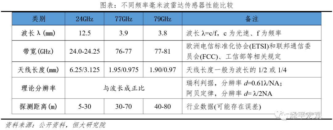雷达传感器方面,由于目前激光雷达技术不成熟、成本高昂,暂时应用很少;而超声波雷达由于声速较慢,反应时间长,探测距离很短,应用很受限;当前自动驾驶主要依赖毫米波雷达传感器。毫米波雷达通过向外发射毫米波,并接收反射回来的信号,达到测速和测距的目的。目前在毫米波领域,开放民用的波段有,24GHz、60GHz、77GHz、79GHz、120GHz;中国市场常用的有24GHz、77GHz、79GHz三种。根据波的传播理论,频率越高,波长越短,分辨率越高,天线体积越小;此外波长越长,方向性差,回波比较少,探测距离也相对较短。从下表可以看出,相比24GHz而言,77GHz、79GHz带宽更大、天线体积更小、分辨率更高、探测距离更长,优势十分明显;目前24GHz主要用于短中距离,用作实现盲点探测系统;而77GHz、79GHz用于中长距离,实现自适应巡航系统;而随着后者的技术走向成熟,将逐渐取代24GHz。