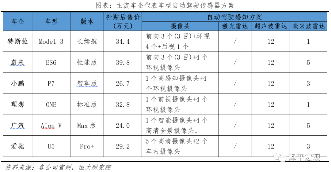 由于各类传感器优缺点都很明显,只有组合使用才能满足复杂的应用场景。下表列举了主流车企代表车型的感知系统传感器方案,从中可以发现,基本都采用的视觉传感器+雷达传感器组合的方案,常用的配置为“1个前视摄像头+4个环视摄像头+12个超声波雷达+3个毫米波雷达”,而激光雷达暂时没被采用。