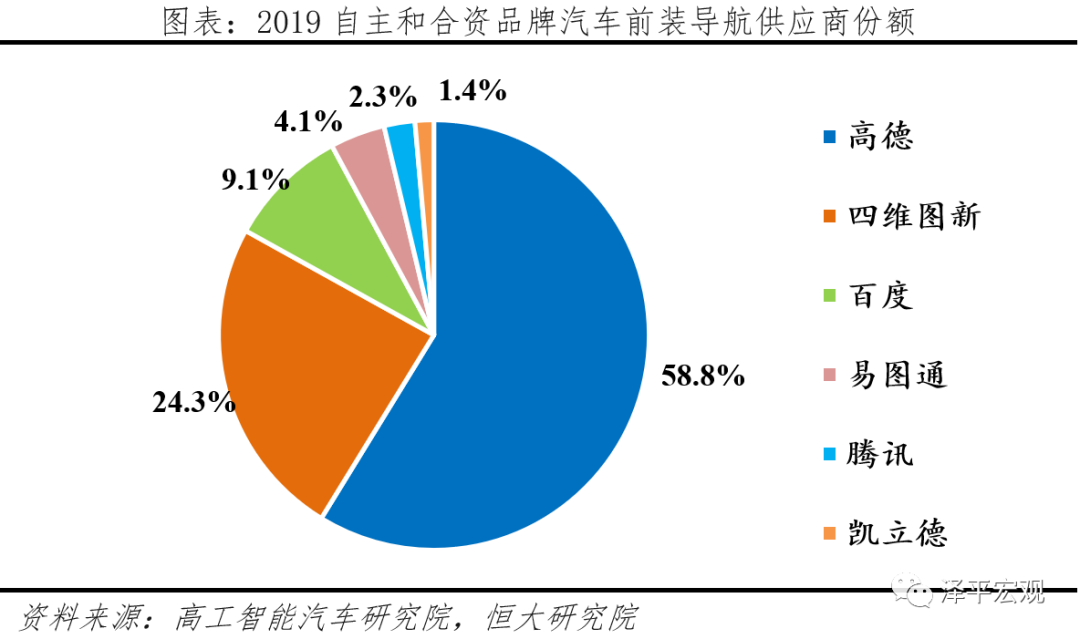 据高工智能汽车研究院统计,2019年中国自主和合资品牌汽车前装导航市场被6家供应商瓜分:高德58.76%、四维图新24.30%、百度9.08%、易图通4.13%、腾讯2.32%、凯立德1.41%;其中高德占比过半。