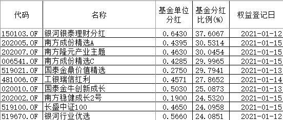 目前已分红基金中,基金分红比例最高的是银河银泰理财分红,该基金分红比例达到37.6%。