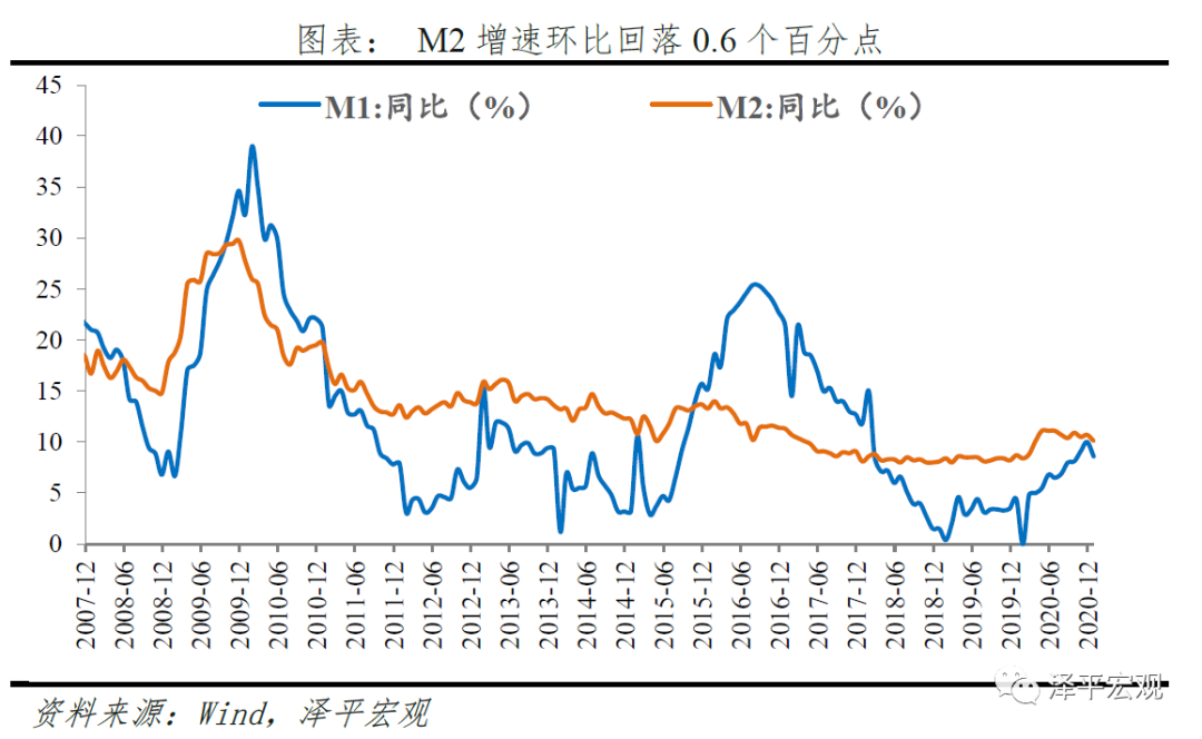 事实上,2020年11月以来,社融增速开始回落。12月存量社融增速13.3%,环比超预期下降0.3个百分点,12月M2同比增速10.1%,环比大幅回落0.6个百分点。信用扩张进一步放缓,广义流动性的拐点进一步确认。