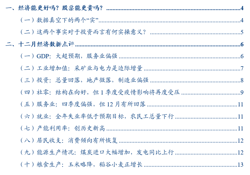 四季度GDP实际增速为6.5%,超我们的预期(6.0%-6.2%)。低估了服务业的上行力度。