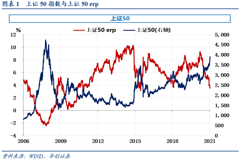 第二,股债的极端估值暗示着股市开始接近拐点。历史上看,ERP指标的相对低位往往同步指引股市拐点风险(对大类资产配置而言,ERP过低意味着买股的性价比已经很低,股票太贵,债券太便宜,应该卖股买债,一般而言是股债跷跷板配置的翻转时刻),准确度极高。根据上证50、上证300、上证综指三个指标计算的ERP而言,目前皆是三年最低位水平,上证50ERP甚至已经低于2015年年中,上证300低于2018年年初,上证综指目前是接近2018年年初水平——也就意味着从指标来看,目前上证50拐点风险>沪深300拐点风险>上证综指拐点风险。