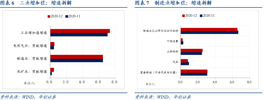 12月工业增加值继续上行超我们预期。毕竟,12月从需求侧看,投资、出口、消费增速都是弱于11月的。我们估计遗漏的变量是天气。12月天冷导致发电尤其是火电发电上行,并带动采矿(煤炭、天然气)增加值上行。12月发电量同比增长9.1%,前值为6.8%。其中,火电同比增长9.2%,前值为6.6%。同时供电的增加,带动了煤炭与天然气的生产。12月原煤产量增速为3.2%,前值为1.5%。天然气产量当月同比为13.7%,高于前值11.8%。