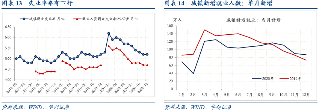 失业率方面,2020年12月份,全国城镇调查失业率为5.2%,与前值持平,也与2019年的12月持平。其中25-59岁人口调查失业率为4.7%,与前值持平,也与2019年的12月持平。2020年年均城镇调查失业率为5.6%,低于6%左右的预期目标。