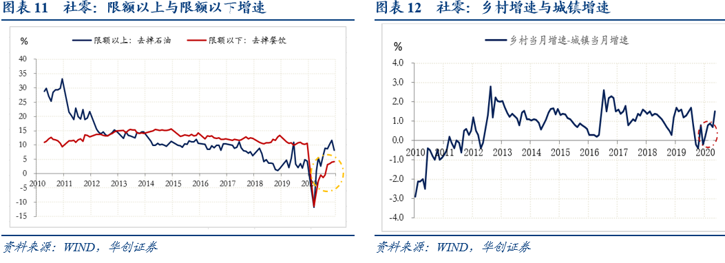2020年12月,限额以上增速为6.6%,前值为8.7%;去掉石油后限额以上增速8.1%,前值为11.6%。限额以下增速为3.4%,前值为3.0%;去掉餐饮以后限额以下增速为4.2%,前值为3.9%。