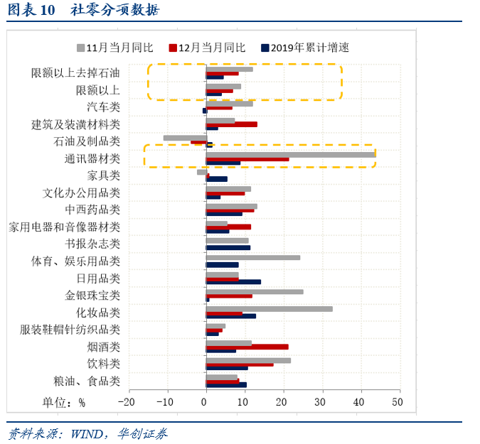 三产进一步的明细数据,有待1月19日公布。目前可以确定是,地产业增速进一步上行(参考指标是地产销售面积,四季度增长12.93%,快于三季度的10.14%)。住宿餐饮业、批发零售业增加值增速好于三季度,但预计仍低于2019年四季度增速。