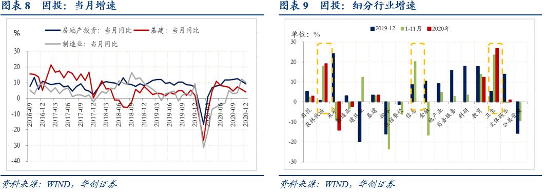 我们重点分析制造业投资。从目前已经公布的13个细分行业的增速数据看,中游投资的走强,是12月制造业投资单月增速继续保持10%以上的重要原因。12月,中游7个行业,贡献制造业投资增速是6.54%,高于前值3.75%。上游3个行业贡献制造业投资增速是3.67%,前值是4.05%。下游3个行业贡献制造业投资增速是0.52%,前值是1.73%。中游细分行业中,增速明显加快的是汽车(12月单月20.9%,11月单月-12.1%)、通用设备(12月单月27.5%,11月单月-3.3%)、专用设备(12月单月32.3%,11月单月13.2%)、电气机械(12月单月27.9%、11月单月-0.9%)。电子设备制造业12月单月增速有所回落,为-3.4%,但11月其增长了36.4%。