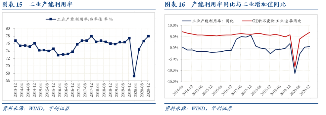 从产能利用率绝对值看,四季度78%的工业产能利用率是2013年以来的最高值。但从产能利用率同比与工业GDP同比来看,四季度的产能利用率同比不算高。(注:理论上,产能不增加的情况下,产能利用率同比=工业GDP同比)。四季度,产能利用率同比是0.6%,略快于三季度的0.4%。工业GDP同比预计是6.9%,同样快于三季度的5.6%。