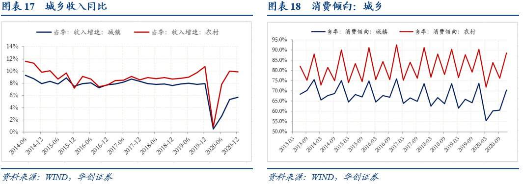 消费倾向有所恢复,但目前仍低于往年。2020年,四季度城镇消费倾向为70.5%,低于2019年四季度的73.7%,差距为3.3个百分点。这一差距在缩小中,2020三季度差距为3.7个百分点。农村情况类似。2020年,单四季度农村消费倾向为88.6%,低于2019年四季度的90.4%。差距在1.8个百分点。2020年三季度的差距为3.0个百分点。