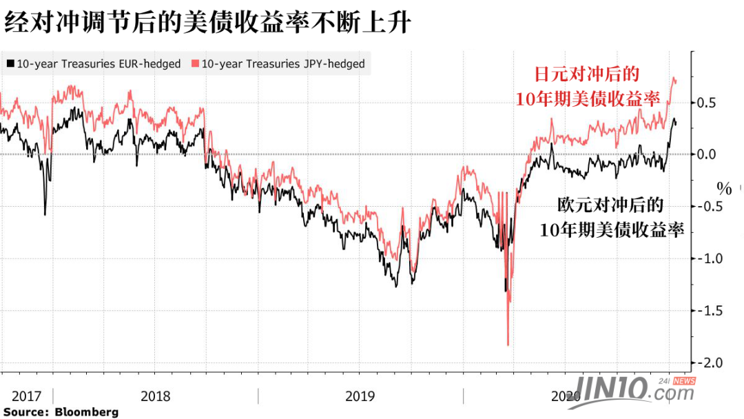 “与其他市场相比,美国国债具有明显的收益优势。对冲货币的成本极低,如果收益率差距进一步扩大,全球资金流将有可能流入美国市场。”