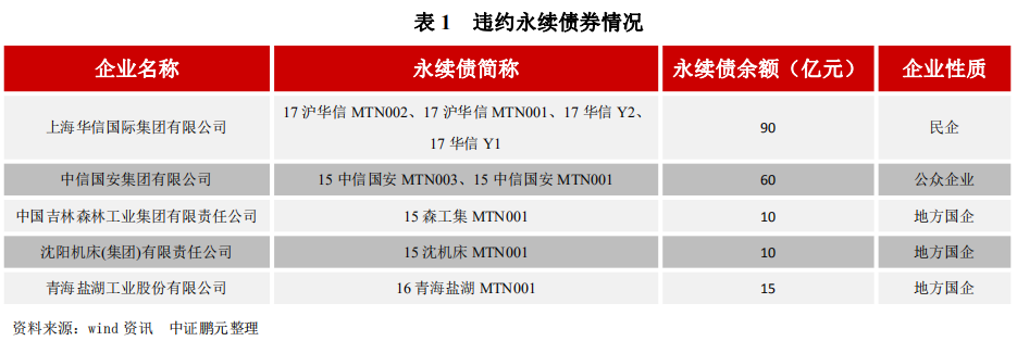 永续债由于没有固定的到期日,即使没有还本付息,对债券进行展期也难以视为违约,但目前债券市场却出现了永续债实质性违约的现象。截止2020年10月15日,国内债券市场共有9只永续债券违约,分别为上海华信国际集团有限公司发行的17沪华信MTN002、17沪华信MTN001、17华信Y2、17华信Y1,中信国安集团有限公司发行的15中信国安MTN003、15中信国安MTN001,中国吉林森林工业集团有限责任公司发行的15森工集MTN001,沈阳机床(集团)有限责任公司发行的15沈机床MTN001,青海盐湖工业股份有限公司发行的16青海盐湖MTN001。其中,15沈机床MTN001、15中信国安MTN001、15森工集MTN001、16青海盐湖MTN001为发行人首只债券违约。