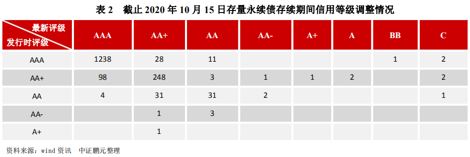 截至2020年10月15日,存量永续债中存续期间发生级别下调的有54只债券,其中,AAA级下调到AA+级及以下的债券共42只,由AAA级下调到AA+级的债券28只,下调到AA级的债券11只,下调到BB级的债券1只,下调到C级的债券2只;AA+级下调到AA级及以下的债券共9只,由AA+级下调到AA级的债券3只,下调到AA-级的债券1只,下调到A+级的债券1只,下调到A级的债券2只,下调到C级的债券2只;AA级下调到AA-级及以下的债券共3只,由AA级下调到AA-级的债券2只,下调到C级的债券1只。存量永续债中存续期间发生级别上调的债券138只,其中,AA+级上调到AAA级的债券98只;AA级上调到AAA级的债券4只,上调到AA+级的债券31只;AA-级上调到AA+级的债券1只,上调到AA级的债券3只;A+级上调到AA+级的债券1只。