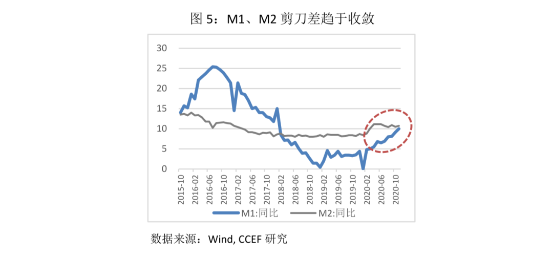 中国方面,有效的疫情控制使经济在4月份就步入复苏进程,因此政策刺激力度也相对温和。在经济发展首要目标从“快速修复”转向“稳定防风险”之际,中央经济工作会议传递了未来一段时间货币政策将更加稳健,但依然保证流动性充沛的信号。从货币供应量看,M1与M2的剪刀差持续收敛,反映出经济活力逐步提升。2021年,随着经济修复的进一步深化,货币活性可能会进一步提升。