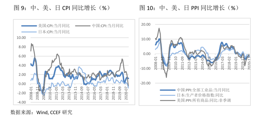 在传统经济学逻辑认为:市场的流动性过剩将指向通货膨胀。但是,自2008年以来,中、美、日三国的央行总资产分别扩张2.2、7.8和6.7倍,基础货币量增长302.9%、613.2%、和670.1%,与此同时,以CPI和PPI为代表的通胀指数在十年内并未有明显的中枢抬升迹象。其背后主要有两方面的原因:一方面,CPI和PPI指数受供需关系的影响。过去近20年中,随着生产技术与全球供应链的日益成熟,劳动力外包、生产资源的跨国流动和新技术的引入缩减了企业的单位生产成本,进口商品低廉的成本和价格有助于压低本国市场物价,缓解通胀指数上升压力。