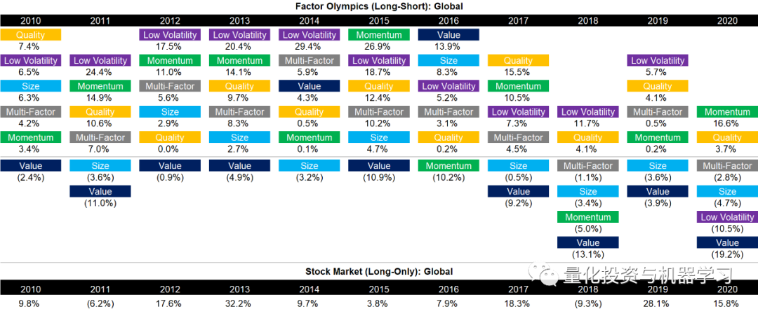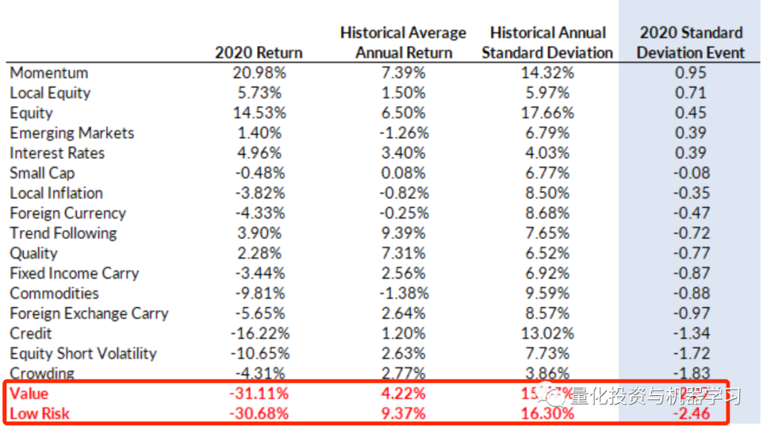 Two Sigma 2020最新的因子报告展示了去年因子的收益情况,以及1996年以来每个因子平均年收益率与标准差: