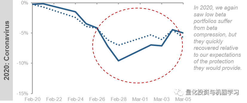 正如我们在市场超卖时所看到的一样,由于Beta压缩的原因(例如,在市场恐慌环境时,之前正常情况下Beta小于的股票的下跌幅度会超过预期),低Beta的股票的表现可能会低于它本身Beta所带来的预期。