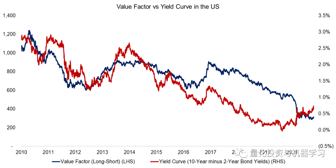 有很多方法来衡量市场结构,使用市场偏度,隐含波动率或类似的指标。例如,过去十年,价值因子和收益率曲线的表现趋势非常相似。