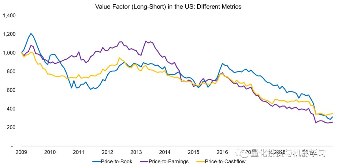 那么,如果我们根据price-to-book,price-to-earnings和price-to-cash来衡量美股多空价值因子的表现,又会怎样呢?从2009年到2020年,这三个指标的趋势基本相同。无形资产可能会影响市净率,但它们对其它两个指标的影响较小。这进一步证明,无形资产的增加并不能解释价值因素表现不佳的原因。