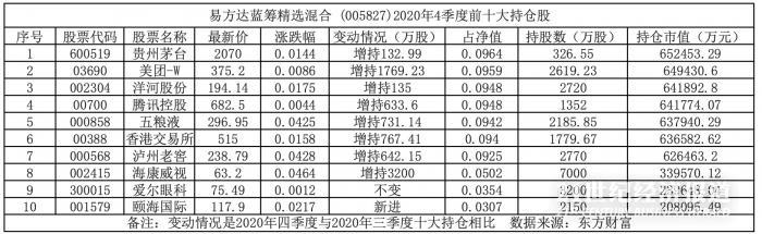 在张坤管理的易方达蓝筹精选基金四季度持仓和三季度末相比,整体变化不大。四季度加仓了贵州茅台成为了本基金第一重仓股,美团位居第二重仓股,此外,前五大重仓股还有洋河股份、腾讯控股和五粮液。而三季度末持有的中国生物制药,已在四季度退出了前十大重仓股之列。