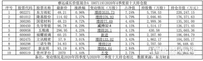 在2020年四季度,刘格菘对隆基股份、通威股份进行减持,亿纬锂能成为第一大重仓股。减仓的同时他加大了对医药的配置,加仓的药明康德成为该基金新进前十大重仓股;三安光电这只芯片股不见身影,同时加仓了面板龙头京东方A。