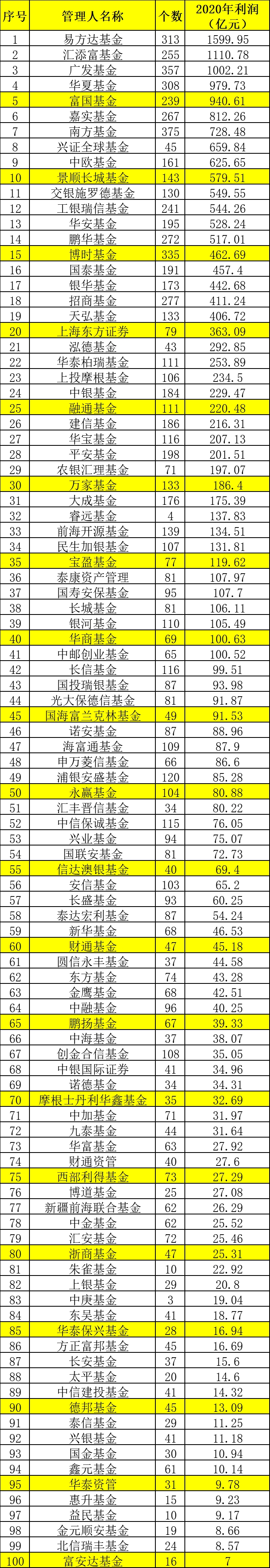 基金君根据天相投顾统计的2020年基金中报和三季报、四季度盈利情况计算,纳入统计的142家基金公司(含有公募资格的券商资管)中,仅1家公司未实现盈利。其中有41家基金公司盈利超100亿元。