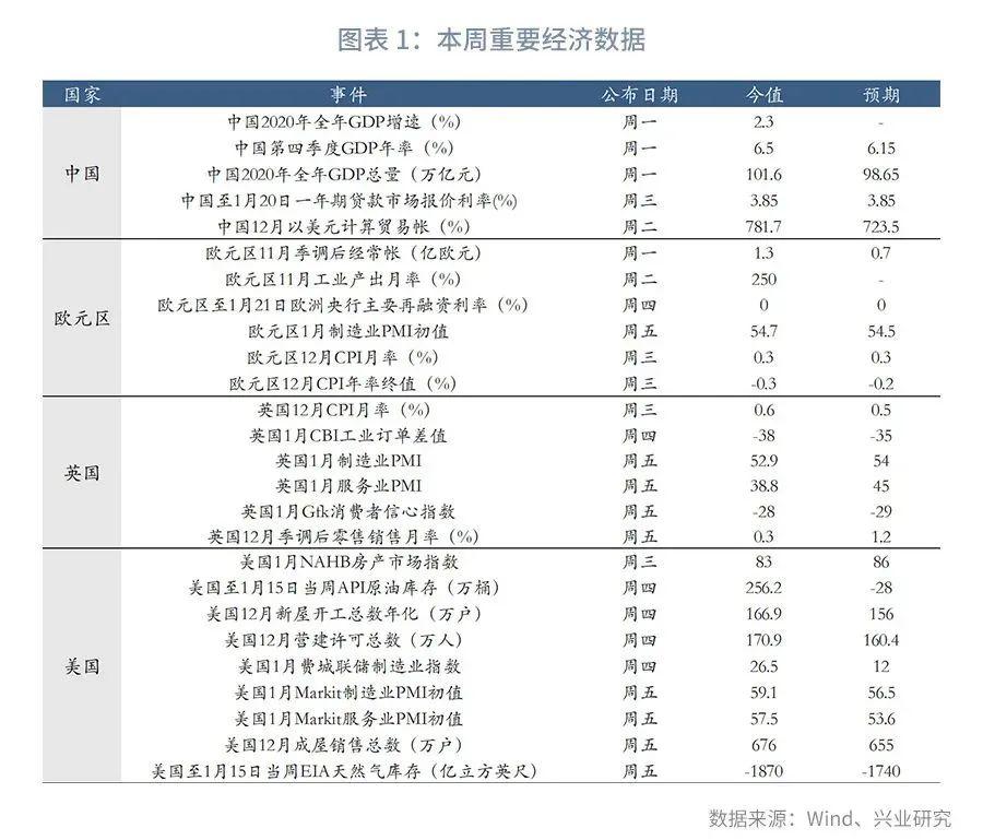 中国方面,中国2020年全年GDP增速为2.3%,低于前值6%。中国第四季度GDP年率为6.5%,高于预测值6.15%以及前值4.9%。中国2020年全年GDP总量为101.60万亿元,高于前值98.65万亿元。中国12月以美元计算贸易帐为781.7亿美元,高于预测值723.5亿美元以及前值754亿美元。中国至1月20日一年期贷款市场报价利率为3.85%,与前值和预测值持平。