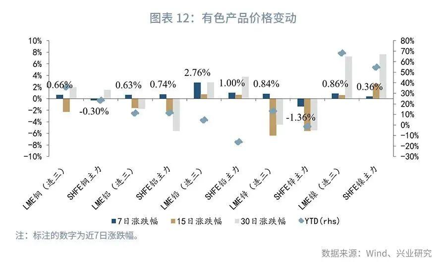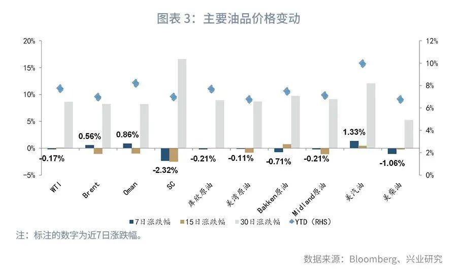 能源:本周油价小幅下跌。目前油价已修复相对公允价值的低估,叠加此前数周美国原油库存持续下降暂告一段落,油价短期继续大幅推涨动能不足。未来几周美国原油库存或持续累积,油价大概率继续承压。
