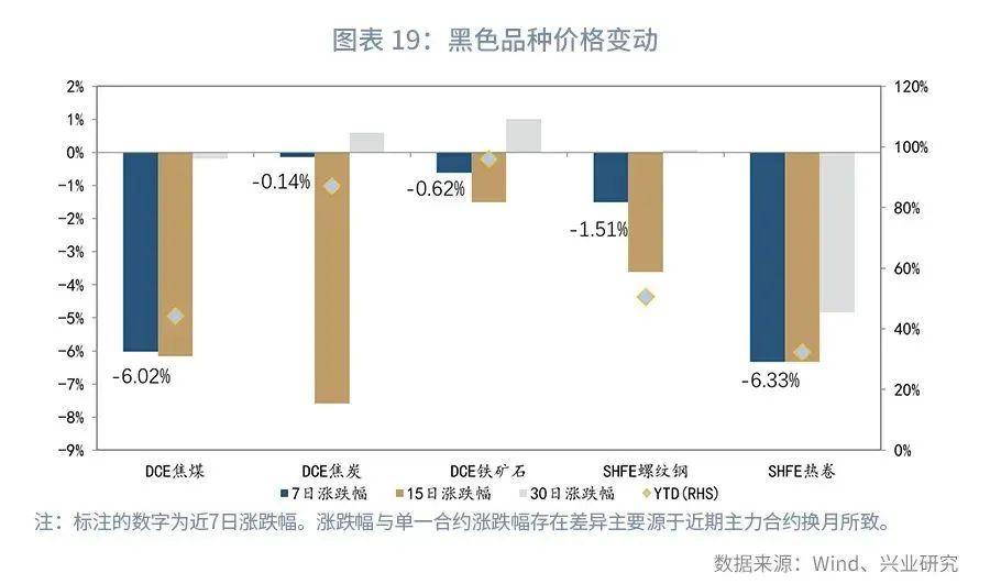 本周黑色品种下跌,焦煤跌6.02%,焦炭跌0.14%,铁矿石跌0.62%,螺纹钢跌1.51%,热卷跌6.33%。