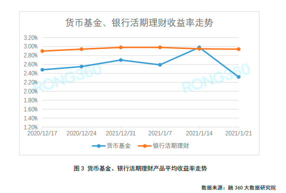 融360大数据研究院监测了货币基金、银行活期理财产品这两类活期理财产品的收益率,上周(1月15日-1月21日)货币基金平均七日年化收益率为2.32%,环比下跌66BP,跌至近两个月新低。