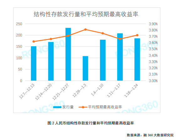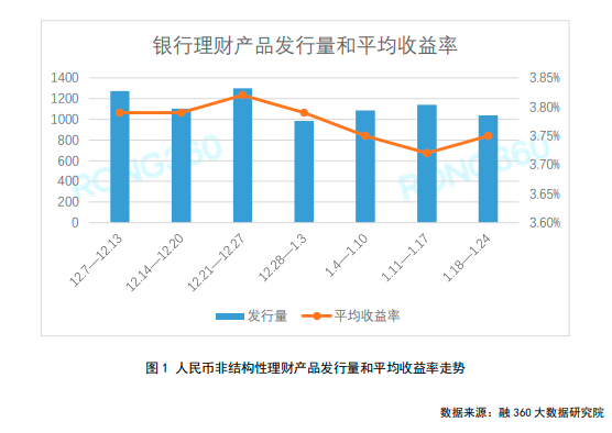 融360大数据研究院监测数据显示,上周(2021年1月18日-1月24日)银行非结构性理财产品发行量共1036只,较上周减少102只;人民币非结构性理财产品平均收益率为3.75%,环比上升3BP。