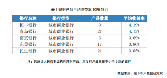 融360大数据研究院对各大银行的理财产品收益率进行排名(周发行量在5只及以上,不含外币理财和结构性理财),数据显示,上周恒丰银行理财产品平均收益率为4.19%,排名首位,青岛银行产品平均收益率为4.13%,排名第二,南京银行产品平均收益率为3.89%,排名第三,东莞银行、民生银行产品平均收益率分别为3.86%、3.85%,分列第四、第五。