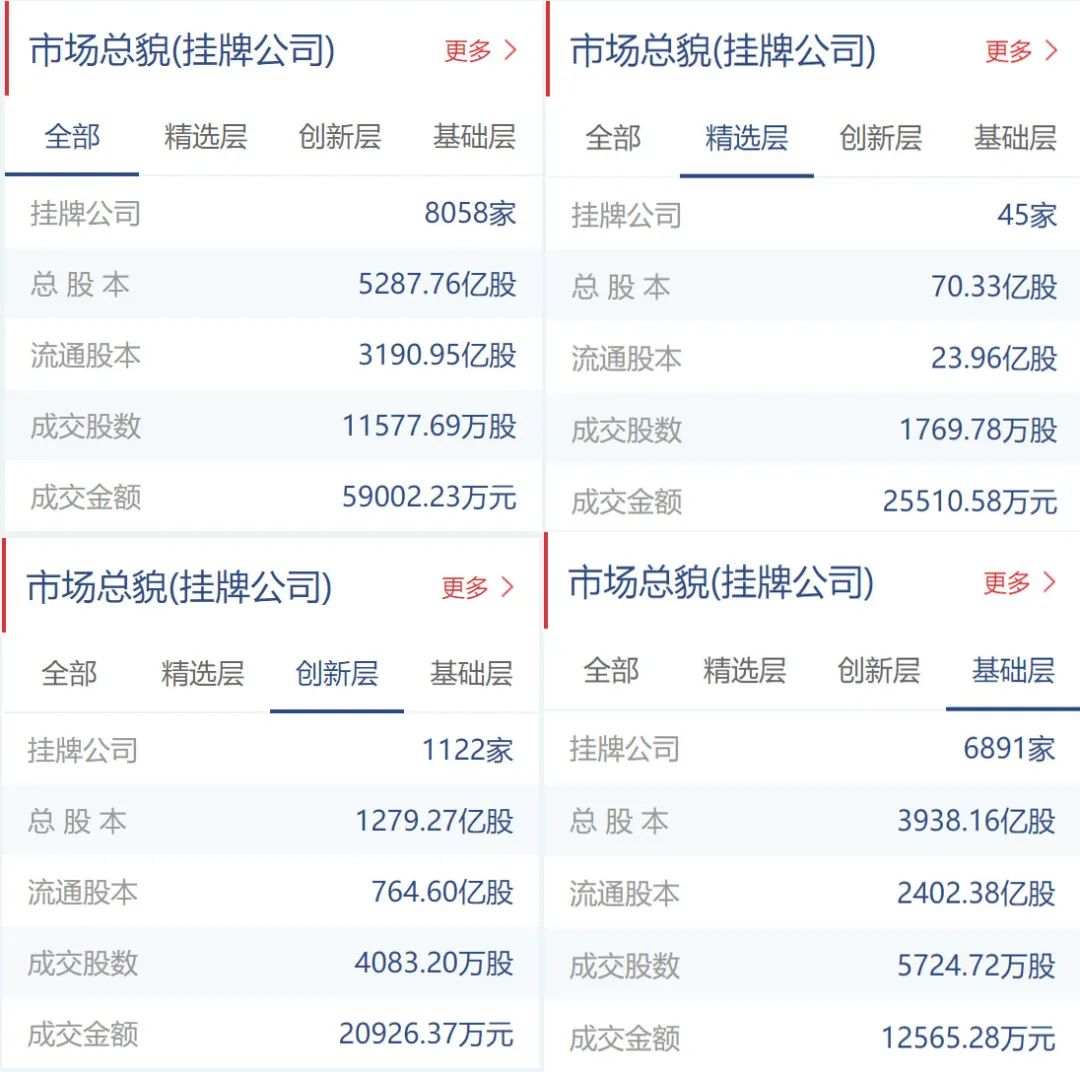 新三板挂牌公司总计8058家(精选层45家,创新层1122家,基础层6891家),总股本5287.76亿股,流通股本3190.76亿股。