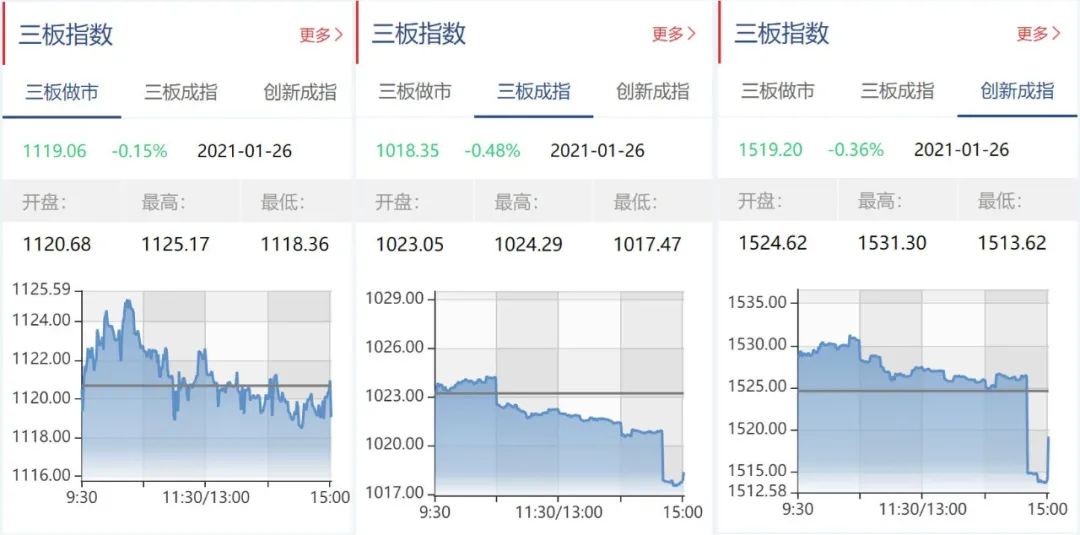 截至1月26日收盘,三板做市报1119.06点,下跌0.15%;三板成指报1018.35点,下跌0.48%;三板创新成指报1519.20点,下跌0.36%。