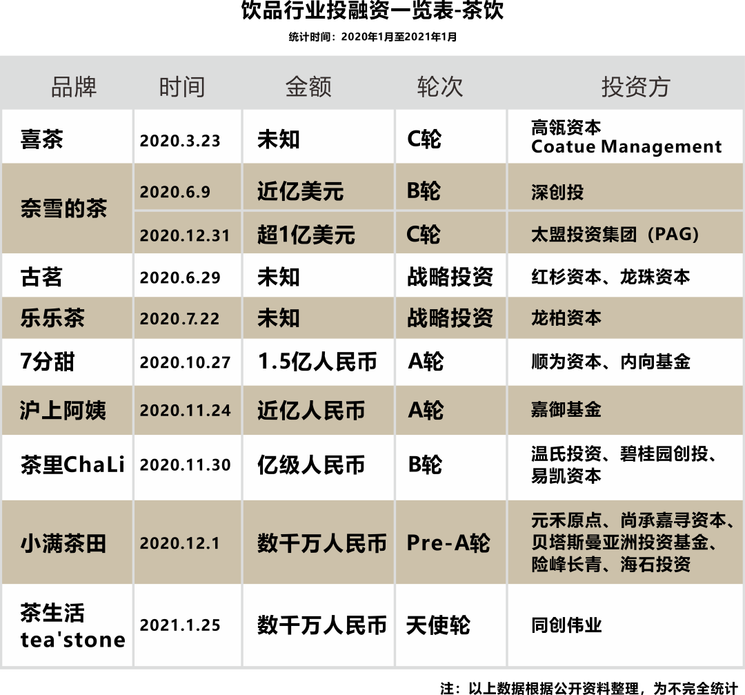 根据公开信息,新茶饮领域,奈雪的茶2020年获得的两次融资都超过1亿人民币。