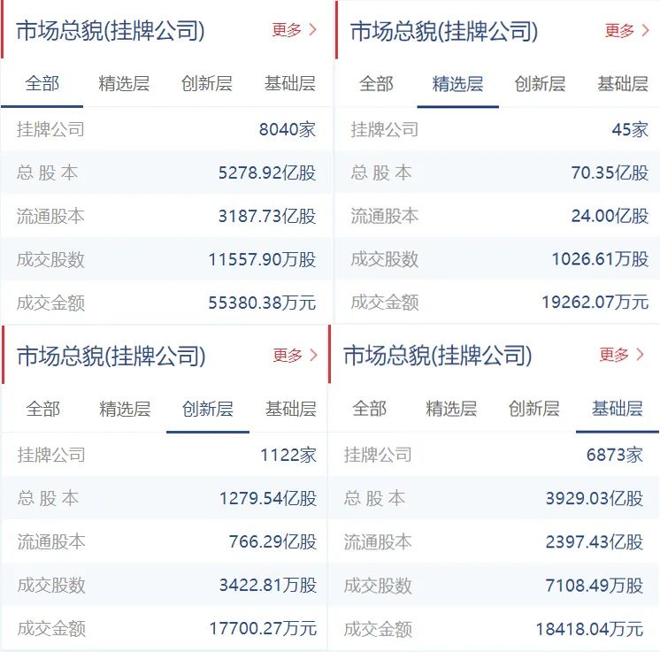 新三板挂牌公司总计8040家(精选层45家,创新层1122家,基础层6873家),总股本5278.92亿股,流通股本3187.73亿股。