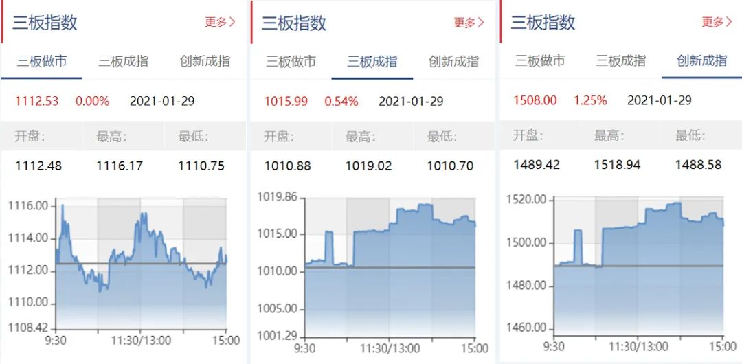 截至1月29日收盘,三板做市报1112.53点,上涨0.00%;三板成指报1015.99点,上涨0.54%;三板创新成指报1508.00点,下跌1.25%。