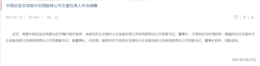 全国股转公司官网1月27日晚间公告,徐明任全国股转公司党委书记、董事长,不再担任总经理职务;隋强任全国股转公司党委副书记、副董事长、总经理。谢庚不再担任全国股转公司党委书记、董事长职务,到龄退休。