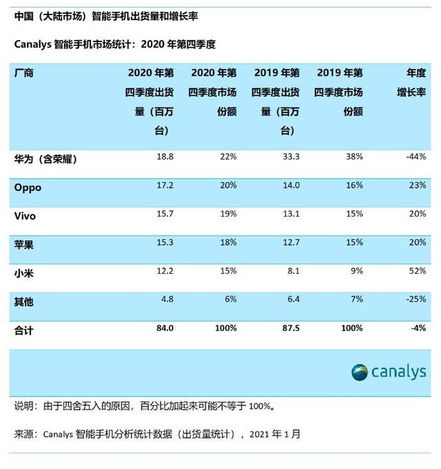 1月29日,Canalys发布了2020年第四季度及全年中国大陆智能手机市场报告,报告显示,2020年第四季度,中国大陆智能手机出货量达到8400万部,同比下降4%,其中华为(包括荣耀)市场份额从2020年第三季度的41%下降至22%,但仍继续保持领先地位,Oppo排名第二,出货量1720万部,市场份额20%,份额有明显的上涨。